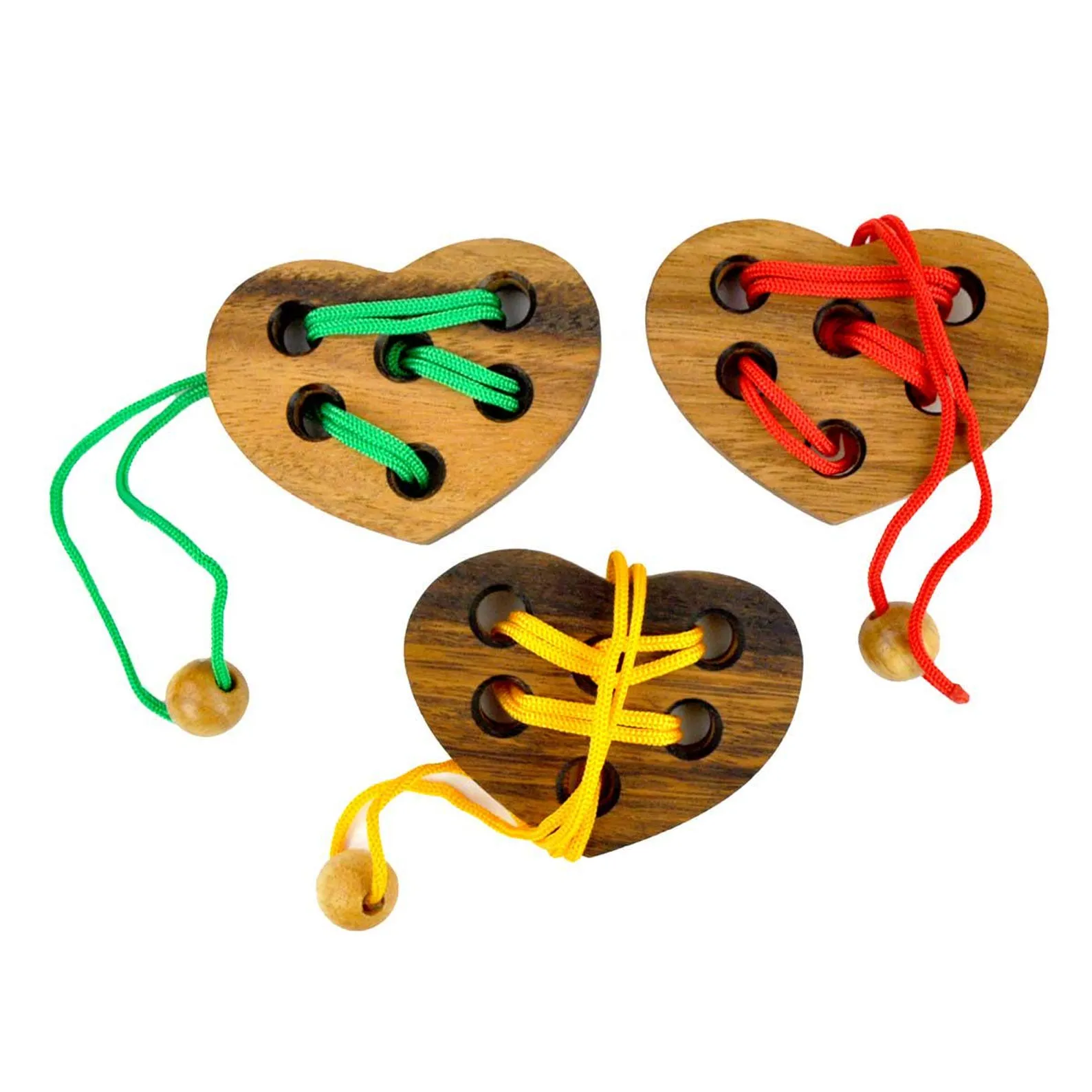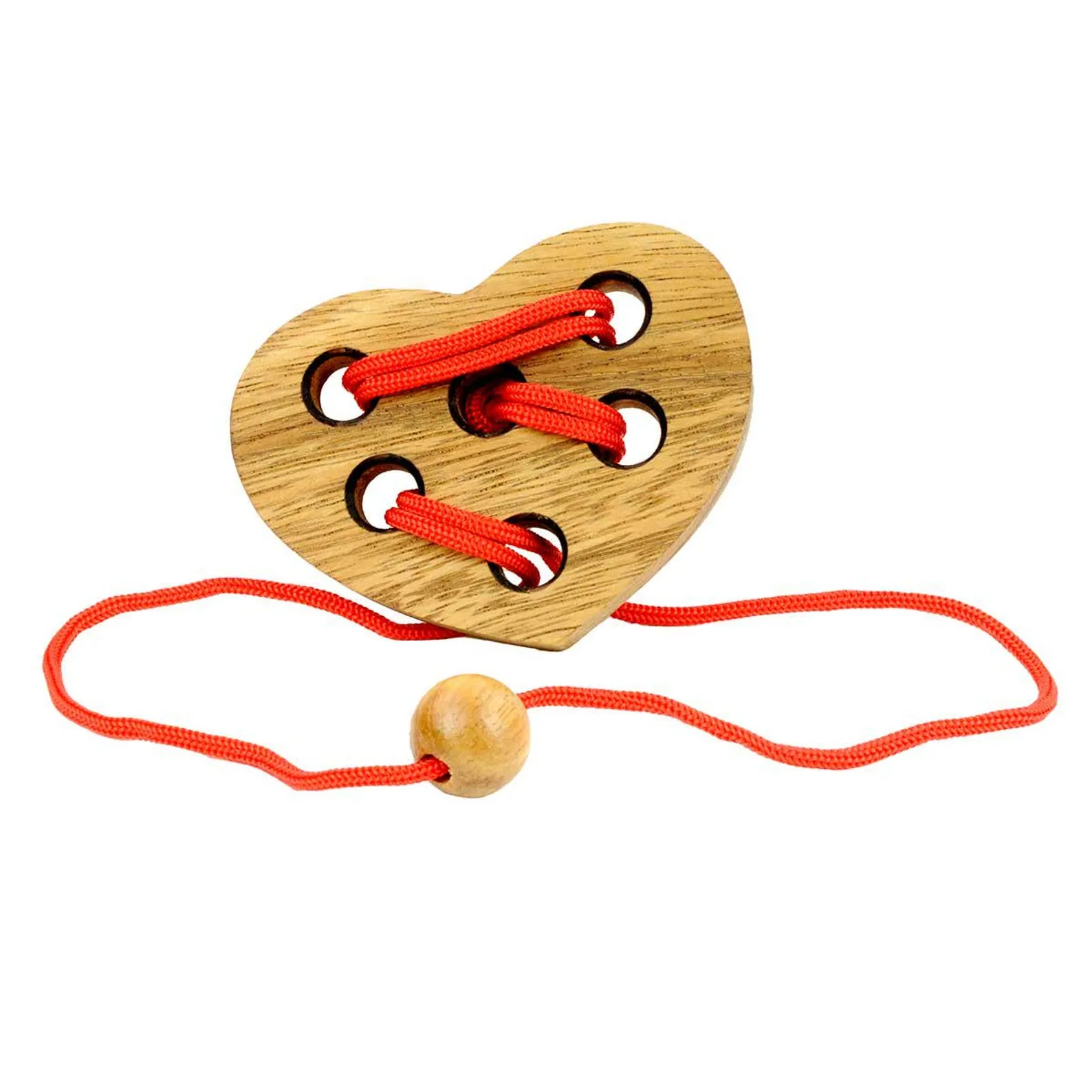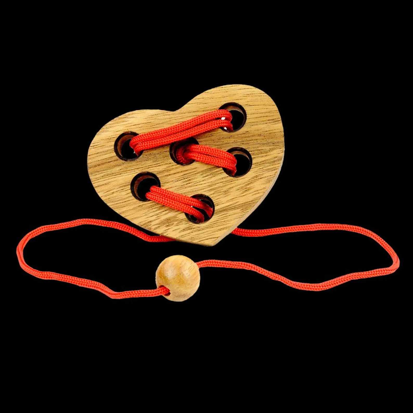 Love Story Wooden Rope And Ring Brain Puzzle is an intricate wooden puzzle that combines shaped blocks with strong cords and rings. Several wooden elements are connected by ropes threaded through carefully positioned holes, creating a visual impression of two pieces linked together. The natural finish keeps the focus on the structure rather than on printed graphics.